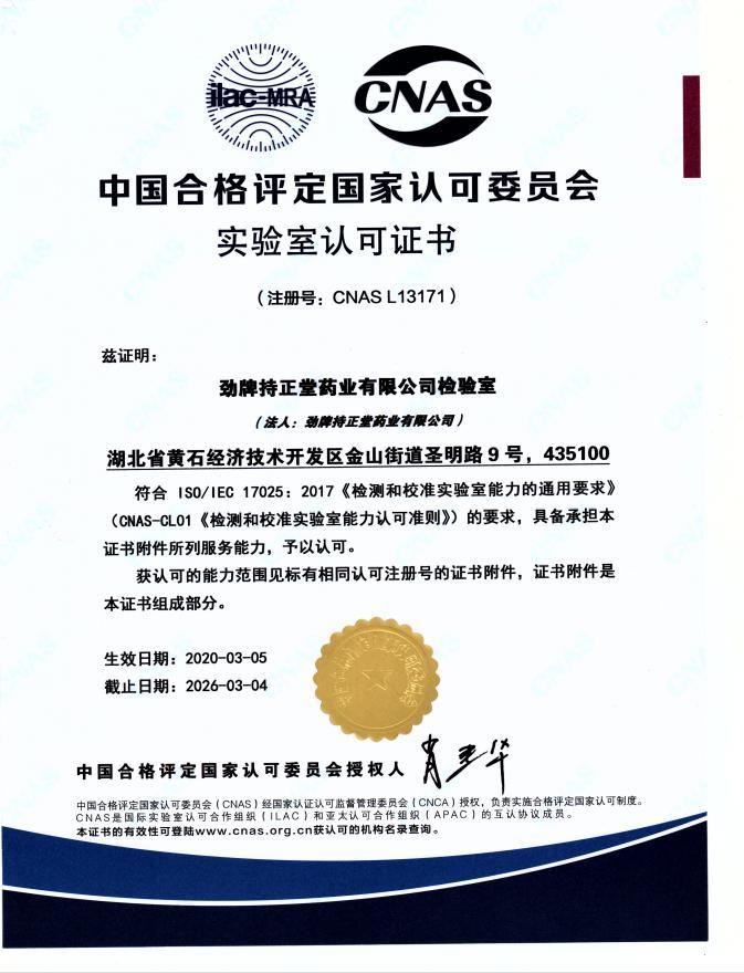 經(jīng)過籌備與協(xié)調(diào),檢驗室于2019年12月14-15日接受了中國合格評定國家認可委員會專家組的現(xiàn)場評審,經(jīng)過質量管理體系運行情況審核、認可項目現(xiàn)場試驗技能考核,專家組一致推薦勁牌持正堂藥業(yè)檢驗室通過國家認可實驗室,檢測能力涉及藥品、純化水、藥用輔料等共12類對象159個檢測項目。中國合格評定國家認可委員會于2020年3月5日正式簽發(fā)CNAS證書。