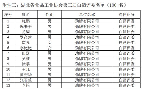 近日,湖北省食品工業(yè)協(xié)會第三屆白酒評委名單公布,勁牌研究院副院長楊強(qiáng)被聘任為白酒專家委員會副主任,高級技術(shù)經(jīng)理童國強(qiáng)被聘任為白酒專家委員會委員,此外胡志平、柯鋒、管瑩、萬朕四名國家評委被聘任為特邀評委。